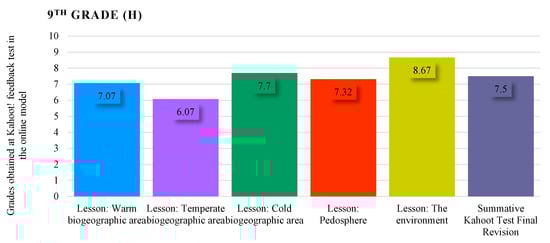 Evolution of student grades in the assessment sequence of the Kahoot! interactive game; type—traditional model of teaching–learning–assessment—9th Grade parallel classrooms A, C, D, E, F, G, H.