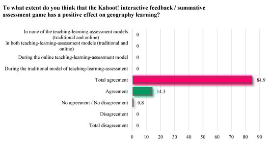 The main purpose of the research was to check to what extent the interactive game Kahoot! helps students to progress and be motivated and interested in the study of geography. It has also been shown that in the traditional model, the supervision and involvement of all students in the teaching–learning process leads to higher performance, and in the online model, the Google Forms tool method combined with a PowerPoint presentation led to the students paying attention and being motivation to learn and develop the competences in the curriculum. Formative assessment is what supports and promotes learning [38,39].