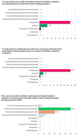 Thus, the minimum and maximum average values are 100% for the total disagreement scale and for student disagreement with the three questions in Figure 9; 84.9% total agreement for the question “To what extent do you consider that the interactive Kahoot! game for feed-back/summative assessment has a positive effect on learning geography?; 77% agreement for the question “To what extent do you consider that the Kahoot! interactive game of feed-back/summative assessment is a motivating tool for teaching activities in geography classes?”; and 87.3% agreement for the question “To what extent do you think you want to use the interactive game Kahoot! in geography lessons as a feedback/summative assessment sequence in the next school year?”
