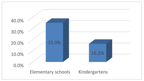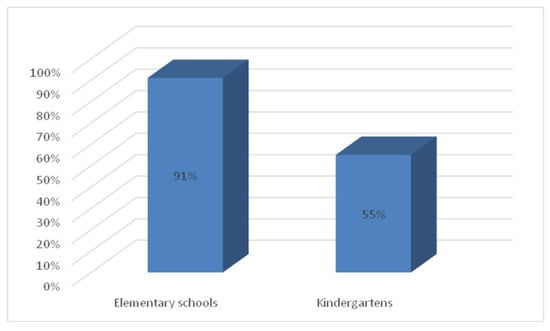 In this study, we explored the degree to which teachers and schools responded to the compulsory adoption of computer-based distance teaching during the COVID-19 era. As we have already stated, we focused on primary education. Primary education in Greece is administrated by the Ministry of Education and is distributed into 58 regional directories of primary education. Our analysis was based on the available data for individual directorates. The number of elementary schools in Greece from which at least one e-class was uploaded was 4171, accounting for 91% of the total number of elementary schools in Greece. Regarding kindergarten schools, we counted 3166 that uploaded at least one document onto the e-class. Unfortunately, that number reflected only 55% of all kindergarten schools in Greece (Table 1 and Figure 1).