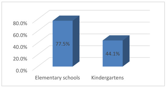 As a matter of fact, the e-class platform was not the only platform that was used by the teachers of primary education. By searching the Internet, we found blogs, web pages, and social media pages (especially Facebook) that had been developed by the schools to communicate with students and their parents or to provide them with necessary information. As can be seen in Table 1 and Figure 2, 77.5% of the elementary schools and 44.1% of the kindergarten schools in our sample developed at least one web tool to communicate with their students and the wider community. The tools that were examined in this study were the schools’ web pages, blogs, and their Facebook pages. The main differences between them and the e-class platforms were their target group and the type of information they provided. Specifically, the e-class was designed for educational purposes. On the other hand, even though the school web pages, blogs, and social media pages contained teaching material, they were primarily developed to provide information to the school’s stakeholders, such as the pupils’ parents and any social groups or individuals who were interested in the school. Furthermore, they also constituted communication tools, since everyone could communicate with the schools using social media, blogs, and the schools’ websites.