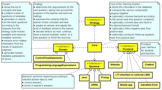 Plug-ins exchange information through the core, but they are independent of each other, making the system’s pedagogical parts (strategies) agnostic of the subject-domain knowledge, and vice versa.