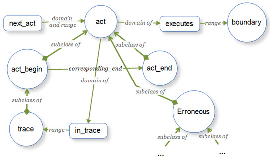 The domain concepts are defined using an ontology. The algorithm is represented as an abstract syntax tree, as in [40]. The classes used for it are shown in Figure 5. The trace is a linked list of Act (i.e., an act of execution) instances connected by the has_next property; it shows the step-by-step process of the algorithm execution (see Figure 6). Single Act instances are created for leaf nodes of the algorithm tree; a pair of corresponding acts (Act_begin and Act_end) represents the boundaries of the other nodes, enclosing the acts of the nested statements. The acts that evaluate control conditions of alternatives and loops contain the values of their conditions. Currently, the domain model contains 29 algorithm elements, 7 trace acts, 29 kinds of errors, 27 explanations for correct acts (total 92 classes), 30 properties, 16 positive rules, 41 negative rules, and 52 helper rules (totaling 99 underlying rules).
