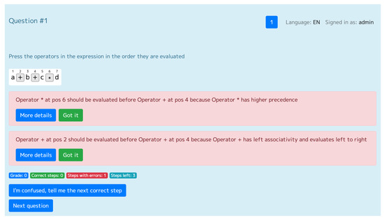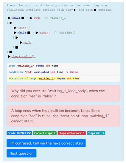 Many IPTS use visualization as a powerful means of illustrating the task and its solutions to easier understanding the problem, its possible solutions, and errors [32,33]. Interactive visualization can provide additional feedback during the task solving to facilitate the student’s progress [32,34,35]. Textual feedback can be helpful as well [29,36,37,38].