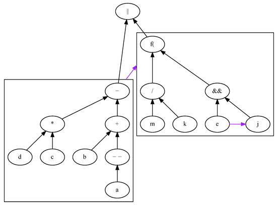 Figure 8 demonstrates the evaluation order graph for the expression 3 in the C++ programming language; the purple arrow pointing between the rectangles shows that the left operand of || (logical or operator) should be evaluated before any operator from its right operand. This notation is used to avoid drawing too many lines between the operators in the left and right rectangles.
