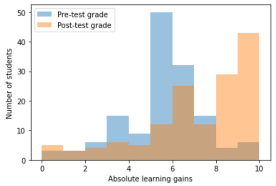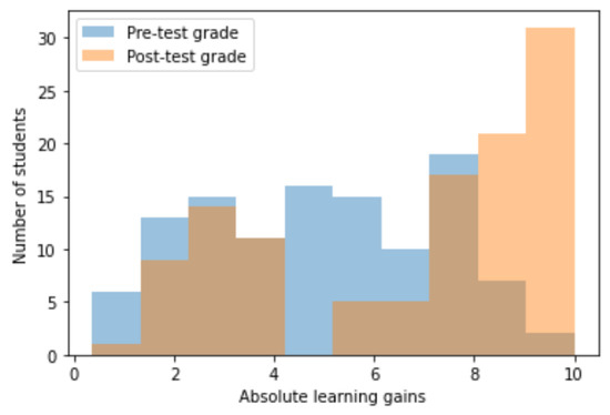 The values of the Pearson’s correlation coefficient between different variables for the Control Flow Statements domain are shown in Table 11. Weak negative correlation between the percent of errors (failed interactions) and the pre-test grade was trivial, showing that better-prepared students made fewer errors. More interesting are the correlations for the post-test grades: there was a medium positive correlation between the number of completed questions and the resulting knowledge, and a medium negative correlation between the percent of errors and the resulting knowledge. The number of completed questions shows a consistent influence on the learning gains, with a weak positive correlation to absolute learning gains and a medium positive correlation to relative learning gains. This shows that the students who did not hurry to the next question, completing each question, gained more knowledge.