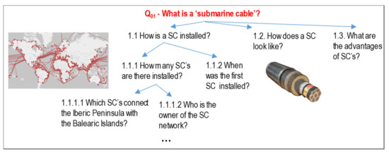 Graphical Q–A map: Arborescent scheme of sub-questions of different hierarchy triggered by the generating question Q01—What is a ‘submarine cable’?