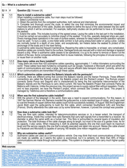Figure 3 shows an example of an ‘output’ structured in the form of questions and answers developed around question “Q01—What is a submarine cable?”