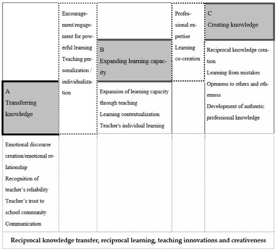 - Category C—creating knowledge—with reciprocal knowledge creation, learning from mistakes, openness to others and otherness, development of authentic professional knowledge.