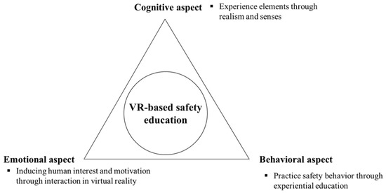 In the past, the focus was mainly on perceptual immersion, such as realism in a virtual space and experiences through senses. However, in recent years, psychological (or emotional) immersion has attracted attention; this type of immersion refers to human interest and motivation through interactions in VR [53], as well as the cognitive, emotional, and behavioral investment of learners when interacting in a virtual environment. There is a trend of expanding its meaning as an engagement that examines the quality of experience according to [54,55,56]. In the field of safety education, it has been difficult for learners to directly link safety knowledge to safety behavior as lecture-style education has become mainstream, because the actual situations cannot be applied in the educational programs due to the risk that learners may suffer safety accidents. When viewed comprehensively, safety education with VR technology can create real situations in VR that are free from the risk of accidents. Therefore, it is determined to be a new educational system that is notable in that it can achieve safety immersion through organic interaction between the learner’s cognition, emotion, and behavior. Figure 1 shows the main elements of VR-based education.