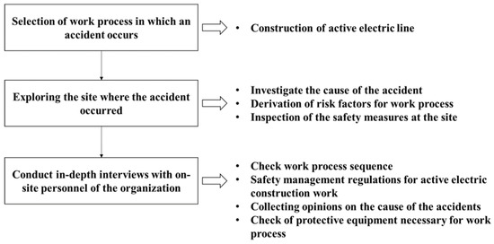 In order to establish a VR-based safety education and training system, the accident process to be applied to the risk scenario for education and training was first selected. In-depth interviews were conducted with stakeholders such as site workers, safety managers, and management to select the accident process to be applied to the risk scenario. In addition, risk scenarios were established by deriving the risk points at the site through field trips and analyzing the causes and effects of existing domestic and international accident cases. The flow chart is presented in Figure 2.