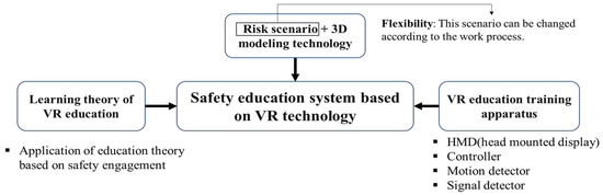A safety education system that applies VR technology was designed according to the theory and design principles related to safety education. First, immersion theory was applied as a theoretical basis for designing a safety education system based on VR technology, where the safety immersion of learners was specifically the main factor. We applied engagement as a design rationale by adding elements of user-system interaction and active participation to the existing immersion theory. The safety engagement of users was also a major factor. Safety commitment includes cognitive, emotional, and behavioral factors for safety, and the main constituents are safety compliance, safety consciousness, and safety behavior, respectively [8,57,58,59].