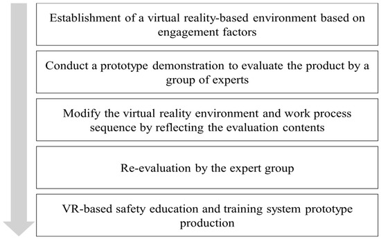In this study, the safety education and training system was constructed as follows by using the learner’s cognitive, emotional, and behavioral engagement of immersion theory in a virtual environment as a framework [55,56].