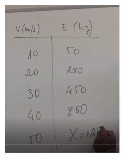 In order to assist students in understanding the phenomenon, PST1 presented on the whiteboard a two-column table (Figure 3) with a made-up set of values of two variables, the car speed (V, expressed in m/s) and the corresponding kinetic energy (E, expressed in kJ) and asked the students to determine the unknown value of the kinetic energy of the car represented by the letter X in the table. After the students interacted in small-group conversations during approximately five min., PST1 promoted a whole-class discussion: