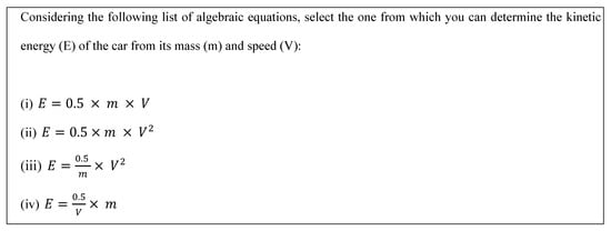 Options included in the students’ task of research lesson 1 for students to select the equation that relates the kinetic energy (E) from the mass (m) and the speed (V) (translated from Portuguese in the task provided to the students).