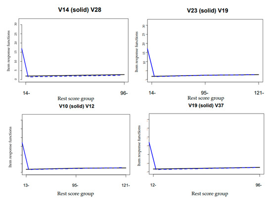 The values in Table 4 represent the number of violations; NAs imply that the item has been removed. Consequently, items 10, 14, 16, 19, 23, 25, 28, 37, 39, 42, 45 and 47 were removed due to significant violations. However, after expunging this set of items, there were no more significant violations of IIO. Moreover, an HT coefficient of 0.35 was estimated for the surviving items, which is above the minimum IIO cut-off of 0.30 suggested by [18]. Based on this analysis, the MSA has established that the thirty-eight surviving items constitute a scale with IIO characteristics, although the scale can also be regarded as one with no accurate precision in terms of IIO. This was further shown using an abridged IRF plot (Figure 1) for some of the violated items, as there was intersection between two IRFs, implying a mutual interplay between pairs of items and indicating one of the two items as misfitting.