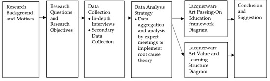Taiwan has been promoting programs and activities related to the inheritance of intangible cultural assets for more than 30 years, and thousands of students have acquired traditional skills as a result. Through the “Transmission Project for Important Traditional Arts Preservationists and Preservation Groups” promoted in recent years and the related data and the project results provided by the Cultural Heritage Bureau, these data have shown that in the year 2020, there have been 68 artists who have completed the workshop, including three artists in lacquerware craftsmanship. To thoroughly analyze how the preservation of lacquerware art craftsmanship carries out inheritance education and sorts out the context of education, this study chose to adopt an in-depth interview method, text data collection, and analysis, etc. The research processes planned in this study is shown in Figure 1. In Figure 1, it is explained that after confirming the purpose of the study, the in-depth interviews and secondary data collection were carried out to collect relevant data, and expert meetings were used to conduct a grounded theory, from which the “Lacquerware Art Passing-On Education Framework Diagram” and “Lacquerware Art Value and Learning Structure Diagram” were proposed, and finally, conclusions and suggestions were made.
