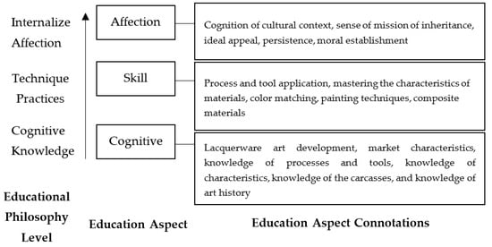 This study was based on the educational goals of cognition, affection, and skills as the analytical structure. From the in-depth interviews and textual data, three coding scholars firstly proposed the “Lacquerware Art Passing-On Education Framework Diagram”, as shown in Figure 2 below.
