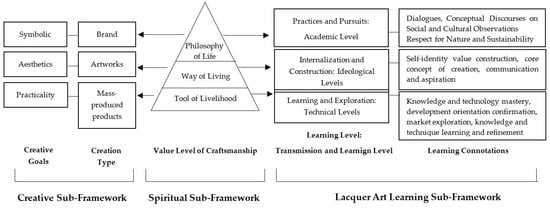 The result of the grounded theory enables us to develop a “Lacquerware Art Learning Framework”, which corresponds to the spiritual structure of arts and crafts values, as well as the creative structure. Therefore, after the expert meeting, we proposed a “Lacquerware Art Value and Learning Structure Diagram” (Figure 3) by integrating the three parts, namely, the learning structure, the spiritual structure, and the creation structure. Due to the limited space, we are unable to fully present all the details of the integration process in this study, so we have placed a comprehensive and simplified Table A1 of the “Lacquer Learning Framework Code” in the Appendix A of this study.