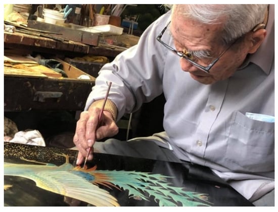 The “Tool of Livelihood” corresponds to the level of learning, where the emphasis is on the cultivation of knowledge and skills of the art students. During the training, the interviewees, who are the preservers of lacquer art in Nantou County, said that in the process of learning lacquer art, they must rooted in their fundamental lacquer art skills and abilities so that they might be able to connect with the market and maintain their livelihoods after graduating. The “tool of livelihood” level is achieved in basic education and learning, which focuses on the cultivation of the knowledge and skills of transmission and preservation project art apprentices. First of all, the basic ability of art apprentices to integrate into the market to make a living after graduation is the main focus. In terms of lacquerware art, it is necessary to be familiar with the process, master the characteristics of various lacquer liquids, flexibly applying various tools and composite materials, and practice on different carcasses. The lacquerware art decoration techniques include lacquer applying, delineation, embedding, Maki-e, the Raden technique (it is a technique in which pieces of shell are attached to the surface of the carcass and then grinded to produce the characteristic color of the shell, and it is called “Luo-Dian” in Chinese,) multiply lacquer layers, stacking, and etching carved lacquer, etc. The surface of lacquer crafts can be treated with delicate painting techniques revealing different colors through different procedures such as polishing, delustering, and consider the texture, natural texture, cracks, and other variants. There are more composite materials such as jade, gold leaf, mother of pearl, eggshells, etc. These embellishments and decorations are the reasons that make lacquerware art unique and varying in visual changes [22]. In addition, learning at this stage needs to cultivate the market demand and consumption characteristics of the domestic and international markets. From the interviews we learned that even the cultural heritage conservators continue to emphasize innovative expressions and visual symbols in each creation, which is also one of the critical points of inheritance education. Such an attitude of constant search for newness, change, and improvement is one of the key points of heritage education.