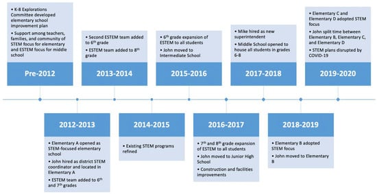 Despite the range of approaches to STEM education, it is clear that school-level systems and supports are needed in order to sustain STEM education efforts [,,]. STEM schools and districts continue to emerge, and while there is some research highlighting the critical components to be included in STEM schools [,,], there is a need to learn more about the process of becoming a STEM school or district. In this study, we investigated a rural school district’s development and expansion of its STEM education focus. In particular, we addressed the research question: How is a district-wide STEM education vision developed, enacted, and sustained by various administrative stakeholders?