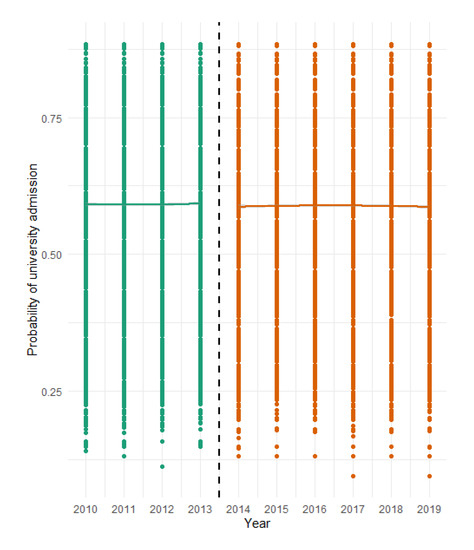Hypothesis 1 (H1). (Extensive margin 1) Reform increased the probability of disadvantaged students being admitted to higher education institutions (hereinafter HEI);