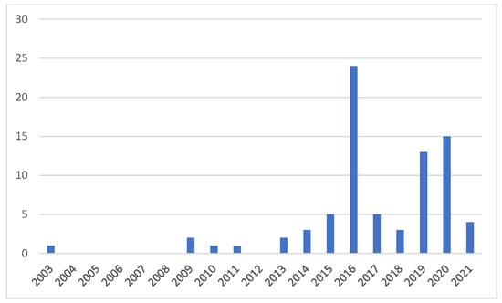 The first article included was published in 2003, with an increasing number of published works over the ensuing seven years, and the highest number of articles, 24, was published in 2016 (see Figure 1).