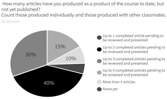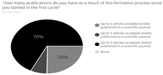This result is important, since eight of these students (40%) claim to have already published two articles, six of them with three articles, three of them with up to four articles and two of them with more than four articles. This last valuation exceeds the possibility of developing articles, which was four, and shows other possibilities generated from this learning process and the new knowledge and management acquired.
