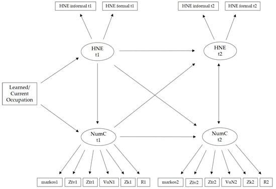 To test the relationships between the learned and current occupations, the HNE, and the numerical competencies of the children, we developed two different models (for learned and for current occupations). Here, learned and current occupations were introduced as manifest predictor variables, and the HNE was introduced as a latent variable comprising the formal and informal HNE. Similarly, the numerical competencies of the children (NumC) were assessed with the numerical tests and then combined in a latent variable.