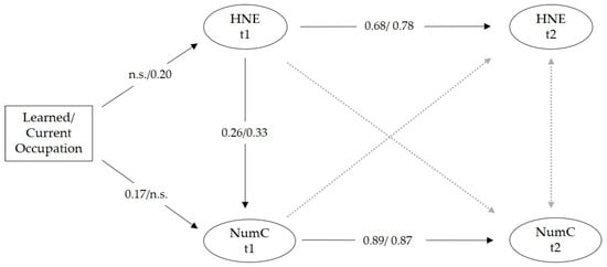 For our final statistical models, the direct paths from the first to the second measurement points of all latent variables were set as autoregressive paths. The paths from HNE t1 to NumC t2, NumC t1 to HNE t2, and NumC t1 to NumC t2, as well as for the relation between HNE t1 and NumC t1, were formed as regressions. Due to current research [,], we expected a direct cross-sectional association between the HNE and the numerical competencies of the children at the first measurement point. Table 4 shows the model fit for our two final models.