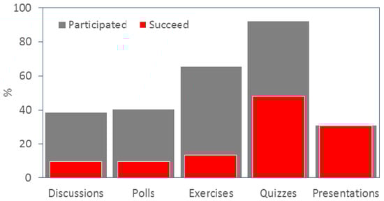 Figure 5 shows the dispersion of AL participants over the five AL forms along with their success. Here, only those students are taken into account, who devoted above 10% of time to AL. The red bars show the percentage of students who have been awarded level 4 or 5 on the 5-score grading scale in a particular form of AL. In the introduction, these students were called “motivated”.
