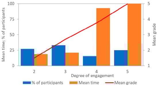 Dependence of mean time used for AL, percentage of participants, and mean final grade on student degree of engagement.