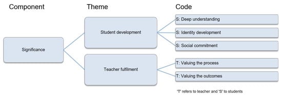 As we wished to remain as open as possible to participants’ experiences of presence, the explicit theoretical reflection on our results was postponed to the final stage of data analysis. Theory informed our interpretive understandings of participants’ experiences of presence [] and illuminated meanings that were present in the data but that we had not discovered before []. For example, by applying the three dimensions of connection to our results, we saw one major new element of teachers’ experiences of presence, namely, teachers’ self-awareness. This resulted in the modification and recoding of “T: Teachers’ educational aims” to “T: Self-awareness”, more broadly referring to their in-the-moment awareness of feelings, thoughts, aims and tensions and its importance to their responsive acting.