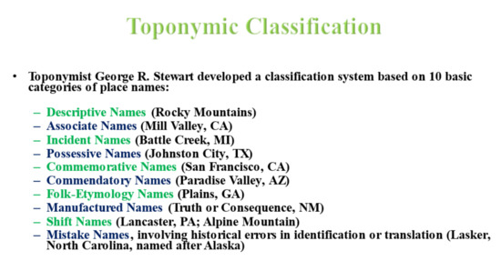 The module also provides students important information relating to current research on Toponymy of a place at a specific, given time and how it relates to the landscape. In the second week of the course, students are asked: how are toponyms classified, especially in relation to the landscape? In this lesson, they are introduced to George Stewart’s seminal work on the classification of place names. The lecturer shows the class Stewart’s ten categories for classifying places which was delineated in his 1975 book, Names on the Globe [54], although the idea of toponymic classification had already been put forth by Stewart in his earlier works [55,56]. Stewart’s ten categories for classifying place names remains widely influential and forms the basis of present research on toponymic classifications as well [57,58,59]. Through this, students become aware that places are named in reference to the landscape, a process which is indicated in the classification system. Once again, in certain naming groups, students witness the connections between humans and the environment they live in as people name their landscapes according to criteria that not only “makes sense” to them but also reflects the community’s identity. Examples of Stewart’s classification categories (see Figure 2) include descriptive names (place names that describe the quality or location of the place; these toponyms essentially name traits about the landscape), incident names (place names from an event associated with a person and the natural landscape becomes connected with humans because of certain historical events that occurred there) and shift names (names that have been transferred from one landscape type to another).