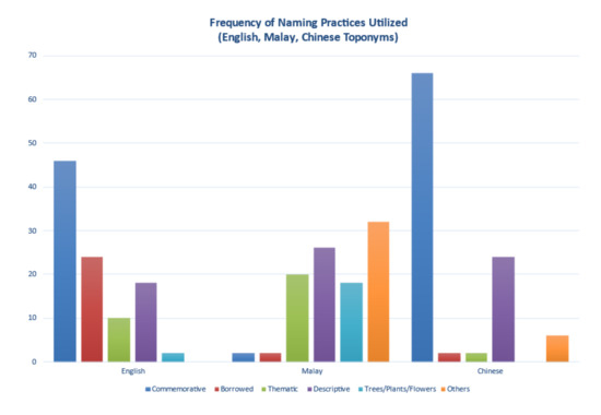 The final lecture of the course, entitled Odonymy in Multicultural and Multilingual Areas: The Singapore Odonymy Case Study, winds up the course through choosing a case study in a context most students are familiar with Singapore-an urban city-state. The lecture content comes from a study [46] aimed at examining naming practices among Singapore’s odonyms (street names) derived from three languages—English, Malay and Chinese. Fifty names from each source language were selected via random sampling and analyzed for their naming practices as well as the reasons for the trends observed in naming practices (see Figure 3 for the results of this study).