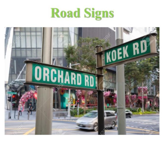 In this lesson, Singaporean street signs, which are seen on this slide, are made the object of study, while also applying previous concepts in a local case study.