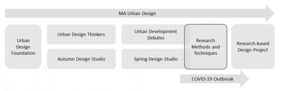 There have been attempts to outline the capacity of certain methods in urban design education, such as urban mapping, digital parametric methods [58], and extensive geospatial databases such as GIS [59]. There has been less scholarly focus on developing pedagogical frameworks based on a more extensive range of urban design methods. This paper focuses on teaching the RMT subject amid the COVID-19 outbreak and the subsequent lockdown in the UK. The primary aim of this subject is to introduce a range of research methods concerning critical questions in the field of urban design. It also seeks to enable students to deepen their methodological understanding and critical thinking in relation to those forms of urbanism that have remained underexplored [60,61,62] and to the ways in which urban places work at the intersections between spatiality and sociality [63], between the measurable and the non-measurable [64], and between urban morphology and streetlife intensity [65,66].