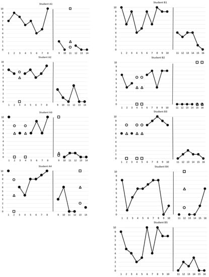 For the purposes of this paper, we extracted data of the nine students from SSR1 and RC1 phases into Figure 1. The dependent variable, shown on the vertical axis, was the number of intervals in which at least one disruptive behavior was observed. It ranged from 0 to 10. The smaller the RC1 scores, compared to SSR1 scores, the more effective was the RC intervention. The breaks in Figure 1 indicate scores missing due to student absence. All students, except for Students B1 and B5, had missing data. Class A missed a total of seven sessions, or an average of 12.5% per student. Class B missed eight sessions, or an average of 10% per student. Missed sessions were not included in Lambert et al.’s analyses of data [34].