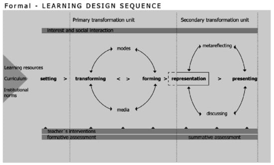 The theoretical perspective used in this article is called “Design for Learning” [25,26,27,28,29,30,31]. The focus is on the representation of pupils’ learning and knowledge, rather than on the reception of information. The theoretical framework is social semiotics [26] and multimodality [25]. The perspective is based on a view of interaction, meaning-making and learning as sign-making multimodal activities, as visualized in the model Learning Design Sequence, Figure 1. This perspective allows for descriptions, interpretations, and analyses of detailed aspects of modes such as text, image, symbols, sound effects, gestures, speech, and colors. The perspective emphasizes communication in situated activities and focuses on a transformation process that children engage in when they learn. The empirical material is analyzed based on the Learning Design Sequence (LDS) model [27], a model used within multimodal design theoretical frameworks.
