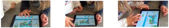 The girls use representational and communicative modes [31] such as movements, images, and colors [30]. Different modes in ScratchJr offer different potential options and impose different limitations for meaning making and interaction on the pupils [29]. The girls recognize and comprehend different affordances [32] that they explore and make use of. For example, the possibility to choose and design a character is explored by the girls, compared to other pupils in the classroom, who only use the pre-selected cat. They engage in what Cervera et al. [6] would call rudimentary skills i.e., implementing an algorithm, debugging, and testing. As with the pupils in Cervera et al.’s study [6], the pupils in this example seemed to be motivated while playing, investigating, observing, and cooperating, letting their own interest guide their design in learning. These actions are illustrated below in an excerpt and in Figure 4.