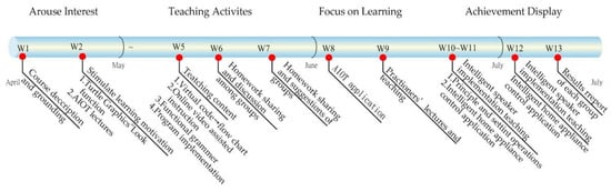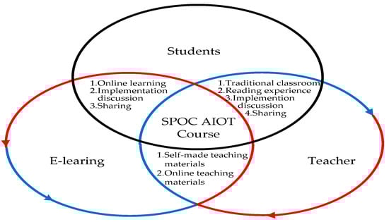 This study planned the course content after determining the course outline in the definition stage. In addition to traditional classroom presentations, existing online instructional videos that are relevant to the course content and no longer than 15 min are available. Secondly, it invited practitioners to join the teaching team for collaborative teaching, and relied on practitioners’ practical experience to make students understand the real needs and pulse of the industry, which not only strengthened students’ theoretical knowledge and practical application, but also gave play to the function of both industry experts and teachers, thus, enhancing the value of education, realizing the spirit of STEM by emphasizing “learning by doing, and doing by learning”, and implementing the characteristics of “practical education”. The teachers’ group listed books related to AIOT, and students could choose a book according to their own interests, thus, enriching their scientific and technological literacy. In order to ensure the effective implementation of the courses in each unit, learning lists, learning experience sharing, and group reports were designed for each unit, which could facilitate understanding of the students’ learning situation, and then, adjust the course content according to their situation. At the end of the experimental course, the SPOC–AIOT questionnaire was filled in to understand the students’ learning outcomes and course satisfaction, as shown in Figure 4.