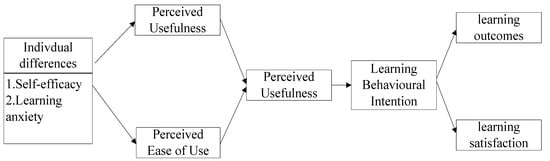 According to [], students’ attitudes and behavioral intentions to using interactive whiteboard technology were verified by the extended technology acceptance model with interactivity and self-efficacy. The results showed that students’ attitudes and behavioral use intentions are affected by interactivity, perceived self-efficacy, perceived ease of use, and perceived usefulness. According to the research results of [], the technology acceptance model is most affected by five external factors: self-efficacy, subjective norms, enjoyment, computer anxiety, and previous experience.