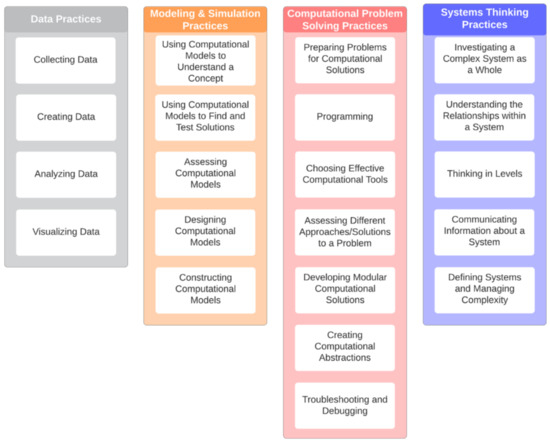 Weintrop et al. [5] developed their Computational Thinking in Mathematics and Science Practices Taxonomy to specifically infuse computational thinking into mathematics and science curricula. These four categories are Data Practices, Modeling and Simulation Practices, Computational Problem-Solving Practices, and Systems Thinking Practices. The full taxonomy is shown in Figure 1.