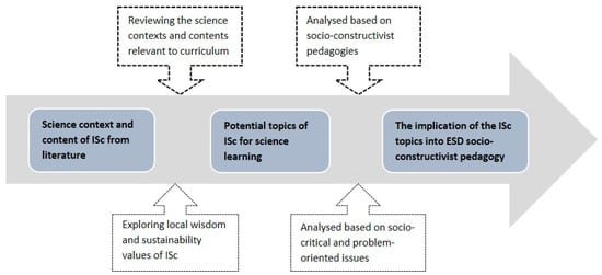 Stage 2—Interpretation of contexts and content from ISc for SSI-based science education: For the discussion and interpretation of the data, science content and contexts related to the curriculum were reviewed. These included the exploration of local wisdom, values, and the foci of ESD. Based on information about the scientific background information on ISc, we could identify content in the science curriculum. The content was then analysed using both the syllabus for Indonesian upper secondary schools and an introductory, university-level science textbook. We explored local wisdom and sustainability values of the ISc topics by identifying the Baduys’ philosophical ideas, cultural elements, and values with regard to sustainability. This step included an analysis of social demands within an educational design framework, so that we could incorporate ISc into science education as was suggested in Zidny et al. [16]. Local wisdom and sustainability values found in ISc are essential when considering the educational significance of possible learning content, especially if these aspects are culturally bound. After this, the ISc content and contexts identified within the Baduy community were discussed using the five criteria for selecting sociocritical, problem-oriented issues for science teaching [19] in relation to a context-based, socioconstructivist pedagogical approach (see [18]). This analysis identified potential ISc topics having sustainability aspects that could be taught in science classes (Figure 2).