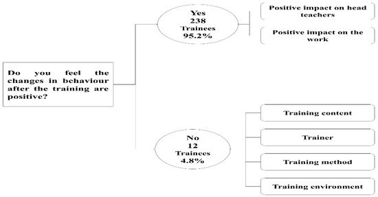 The introductory part of the qualitative investigation included a closed-ended question that examined whether participants felt that their behaviour change was positive after completing the training course or not. Subsequently, a further in-depth investigation was conducted to determine their reasons for choosing a positive or negative response, and the impact of the changes on them and their jobs.