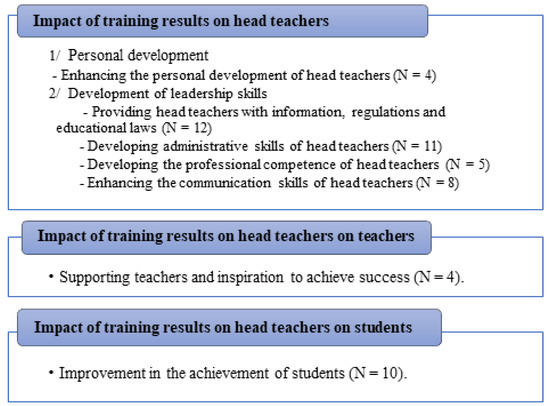 The aims of the training are to raise the levels of awareness and understanding of the trainees through the development of skills, knowledge and trends that are required by the institution [122], and to provide trainee head teachers with information and skills commensurate with the nature of their work. Therefore, the belief of trainees and the confirmation of supervisors that training programmes have a positive impact on trainees’ knowledge and learning indicate that the implementation of training programmes for female head teachers has achieved the result at the learning level, which aims to continue their education by providing them with information, management skills and technical and educational theories that better enable them to do their work [123].