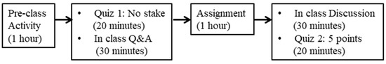 Pre-class activity(out-of-class): Students were required to self-study foundational concepts delivered by the instructor online in their own time. The online cloud-based learning tool is VoiceThread. The online lecture included PowerPoint slides and narration from the instructor on each slide. The estimated time needed to study the online material was one hour. The pre-class activity was designed to reduce the classroom instructional time on facts-based content, and allow more time for students to do assignments and for discussion.