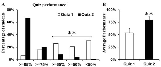 Students’ average quiz performance improved after assignment and discussion. (A) Performance of students in Quiz 1 and Quiz 2. There were significantly more students scoring below 75% in Quiz 1 than in Quiz 2. (B) Average performance of students was significantly higher in Quiz 2 than in Quiz 1. ** p < 0.01.