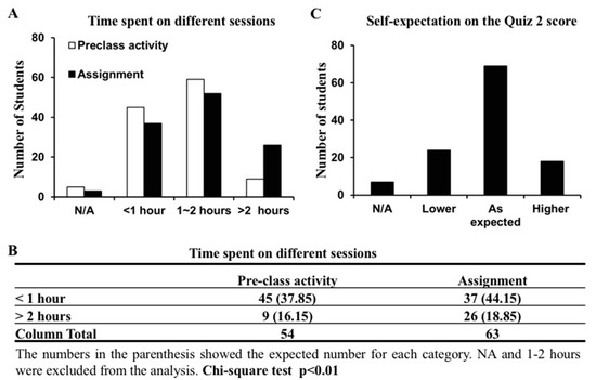 Students’ performance met their own expectation based on study time. (A) The number of students spending less than 1 h, 1–2 h, or more than 2 h on the pre-class activity and the assignment respectively. NA: Did not do the pre-class activity or the assignment. (B) Contingency table showing the observed number of students who spent less than 1 h or more than 2 h on the pre-class activity or the assignment. Chi-square test showed significant difference (p < 0.01). (C) The number of students who felt the Quiz 2 score was lower or higher than expected or as expected based on the study time. NA: no expectation.