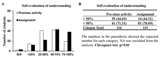 Students’ self-rated understanding improved after the assignment. (A) Students’ self-rated understanding of the content after the pre-class activity or after the assignment. (B) Contingency table showing the observed number of students who understand less than 50% of content or more than 50% of content after the pre-class activity or the assignment. Chi-square test showed significant difference (p < 0.01). NA: Did not do the pre-class activity or the assignment.